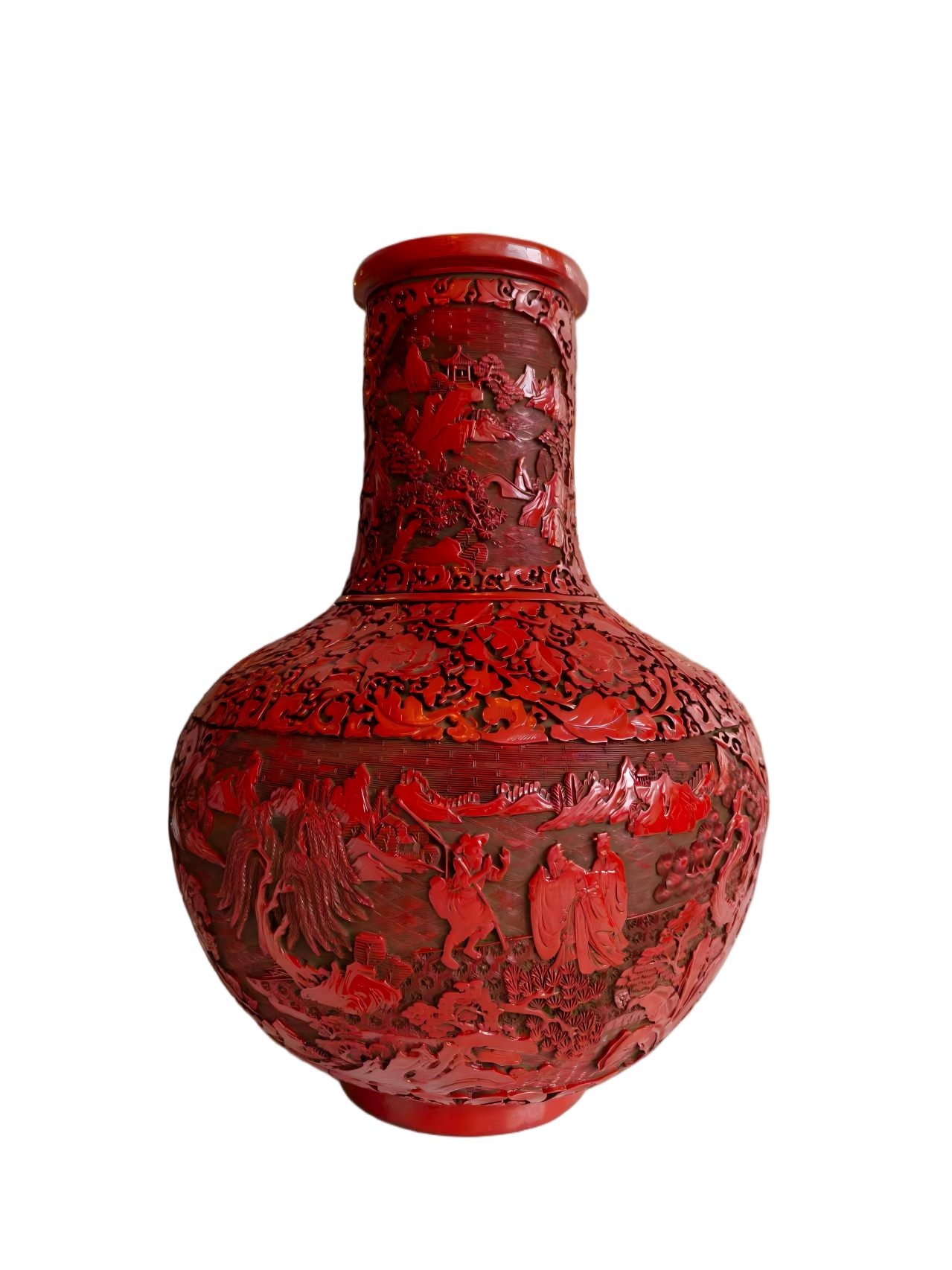 工艺价值:乾隆雕漆的巅峰技艺。天球瓶弧面雕刻需兼顾透视变形,而通体满工高浮雕在漆器中比较少见——漆层需积累数百道(耗时2-3年),胎体需掺麻布、金属丝防裂。参考故宫博物院藏乾隆剔红百子图大瓶。