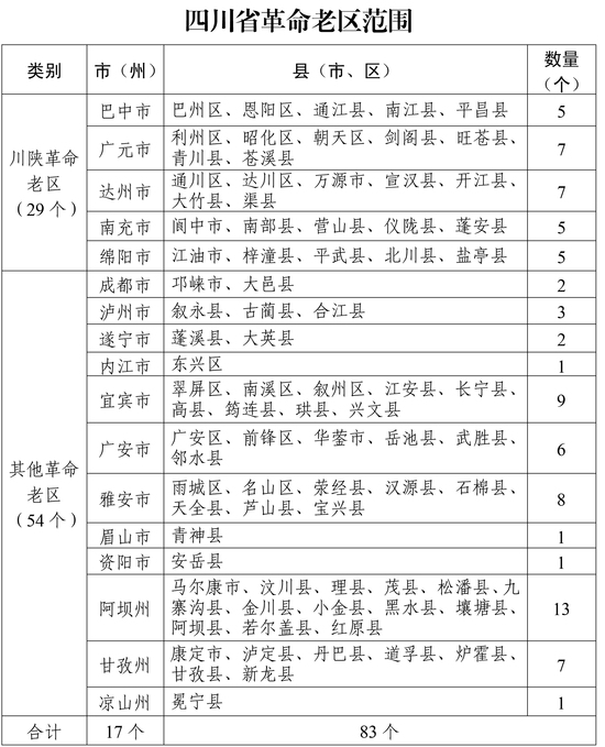 (三)实施范围。我省革命老区包括17个市(州)所辖的83个县(市、区),其中川陕革命老区包括巴中、广元、达州、南充、绵阳等5个市所辖的29个县(市、区)。